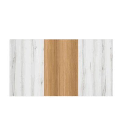 El cabecero Sena de 200 cm combina un acabado blanco con un panel central decorativo en listones de madera en color tostado, aportando calidez y estilo contemporáneo al dormitorio. Su diseño minimalista y horizontal crea un fondo elegante y relajante para la cama. Fabricado en tablero melaminizado con cantos en PVC, garantiza resistencia y durabilidad en el uso diario.