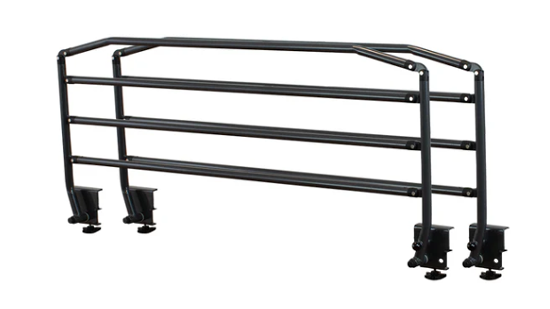 Juego de 2 barandillas abatibles de acero con 4 barras horizontales, fáciles de plegar para facilitar el acceso y atención al paciente. Compatibles con somieres metálicos de perfil máximo 7 cm de alto y 3 cm de ancho, no válidas para canapés ni bases de madera.