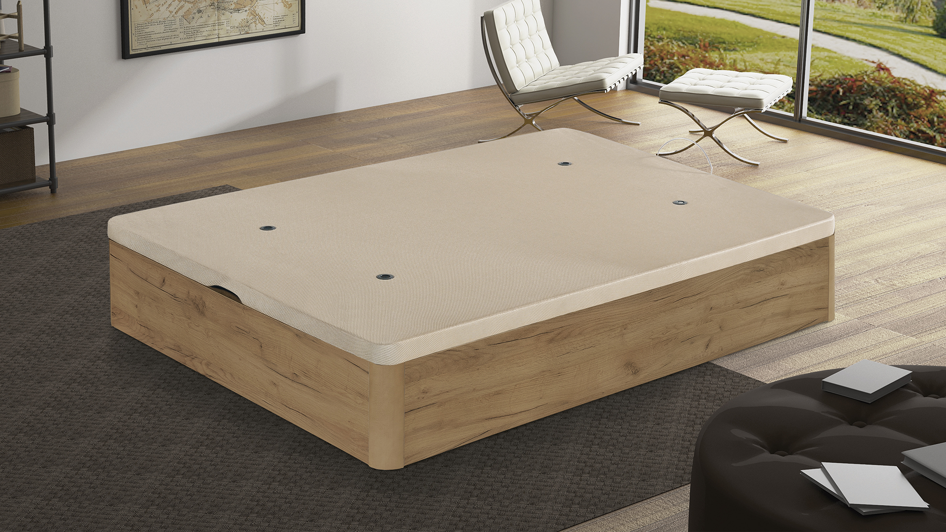 Canapé Copenhague 30 con estructura de madera de 22 mm y 35 cm de altura. Tapa tapizada en 3D transpirable con refuerzo metálico y 4 aireadores. Gran capacidad interior de 28 cm.