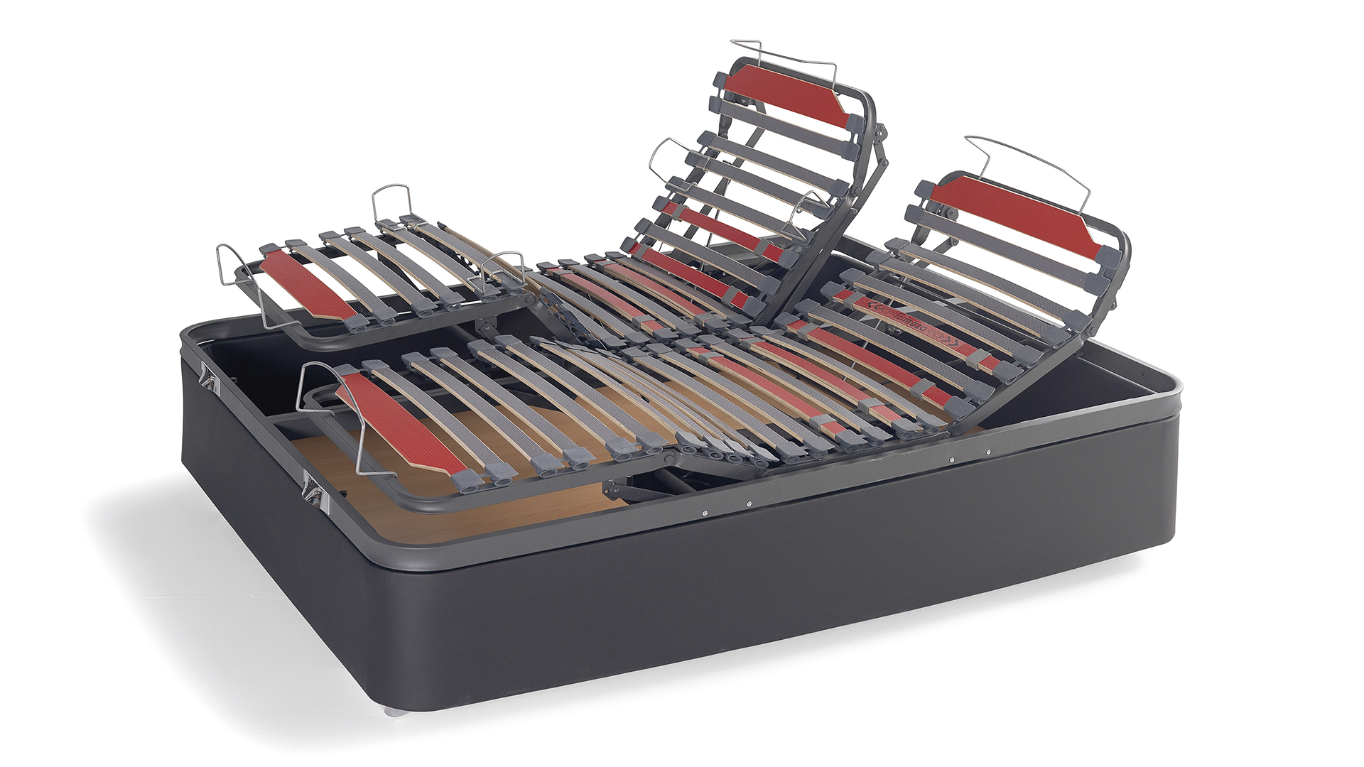 Canapé Iron 30, con cajón con un espacio interior de 28cm, y tapa tapizada con tejido 3D de 3 cm. Incorpora somier articulado con motory sistema i-MOVE (mando inalámbrico y app móvil). Estructura robusta, aireadores de ventilación y diseño moderno. Tapizado en diferentes colores a elegir. Altura total: 35 cm.