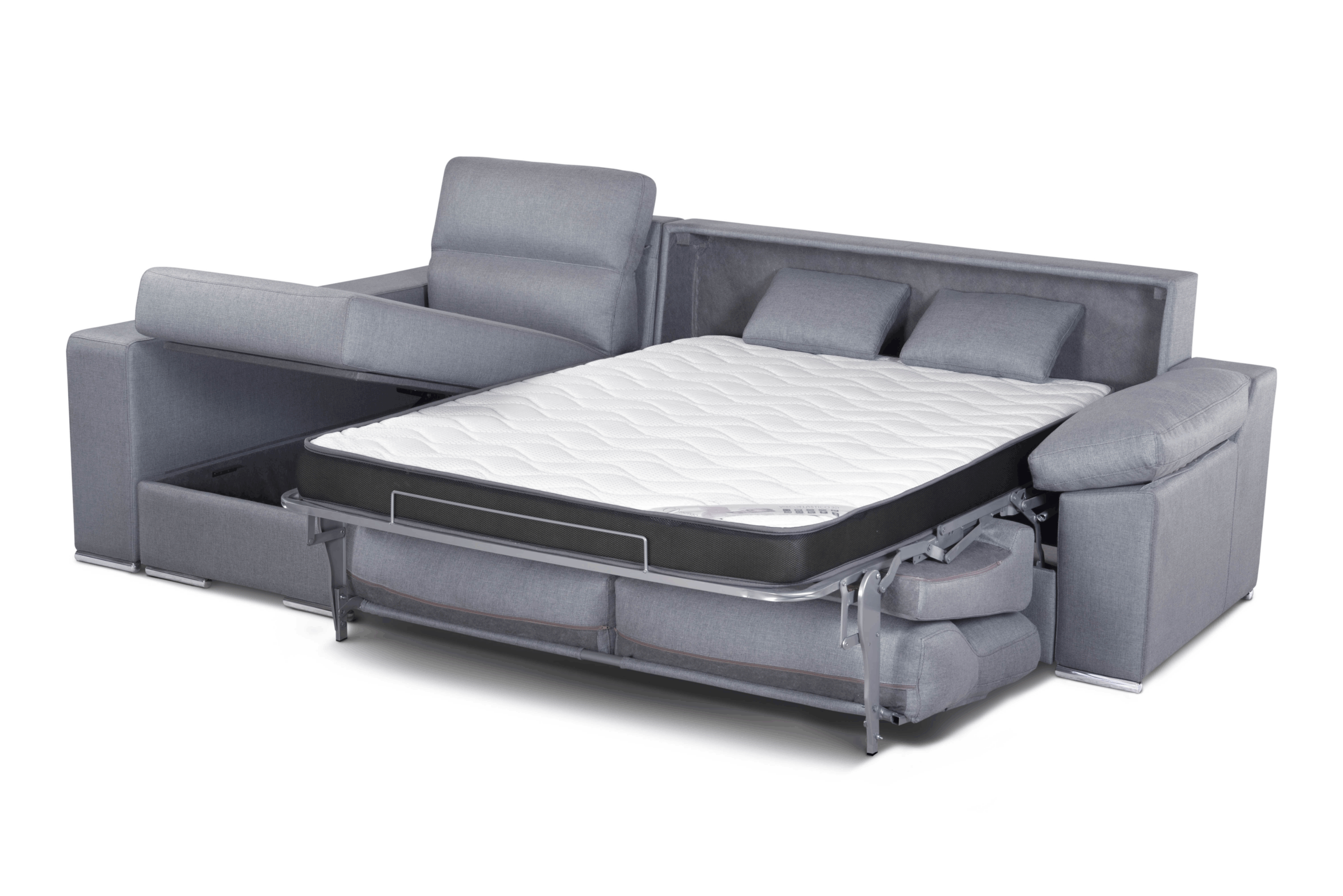 El sofá cama con chaiselongue Luna cuenta con estructura de madera de pino y mecanismo italiano de fácil apertura con malla electrosoldada. Los asientos están fabricados en espuma de poliuretano de 30 kg y los respaldos en fibra hueca siliconada, ambos desenfundables para facilitar la limpieza. Incluye brazos también desenfundables, chaise longue largo con dos cojines decorativos y patas metálicas cromadas. Ideal para quienes buscan funcionalidad, confort y diseño práctico.