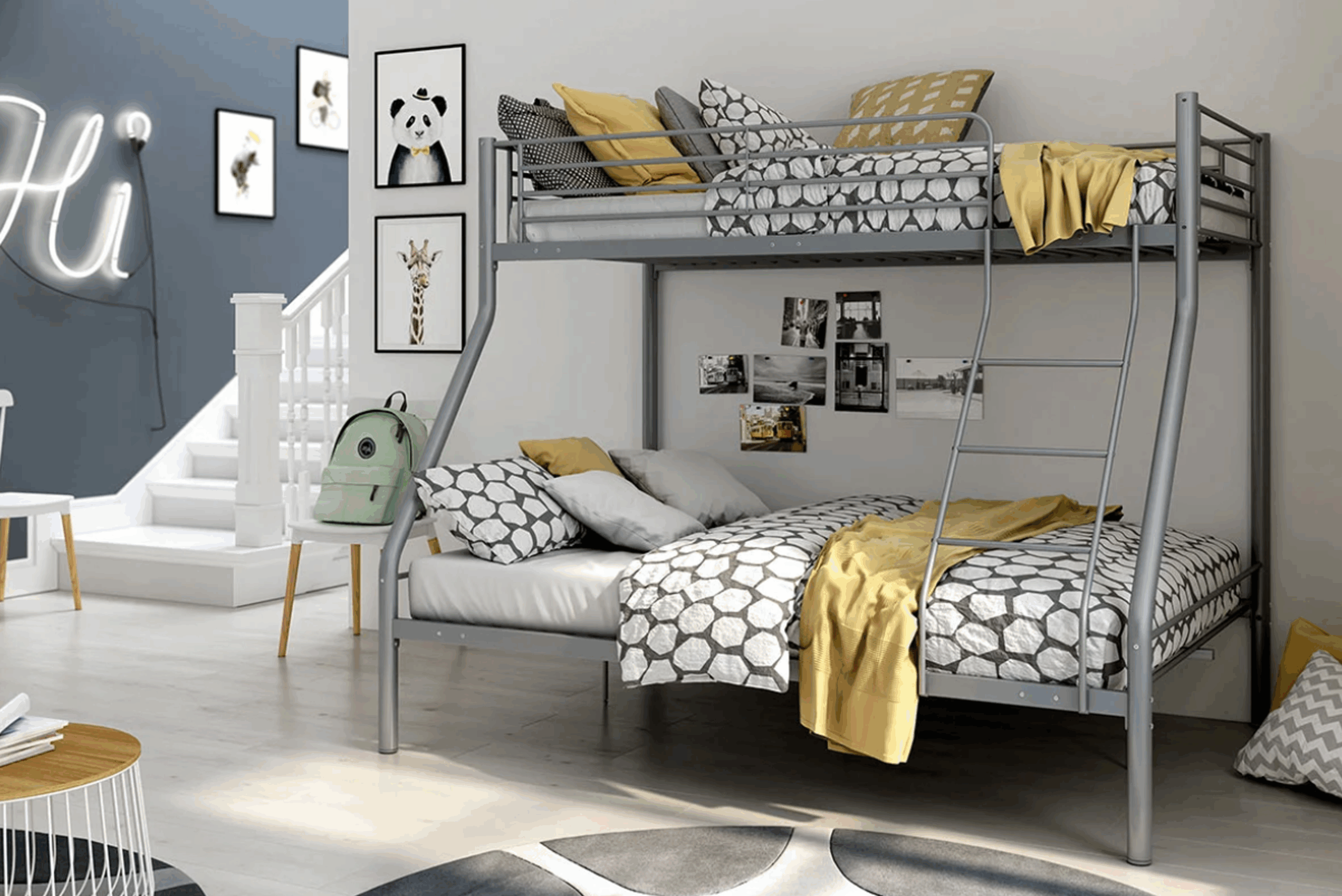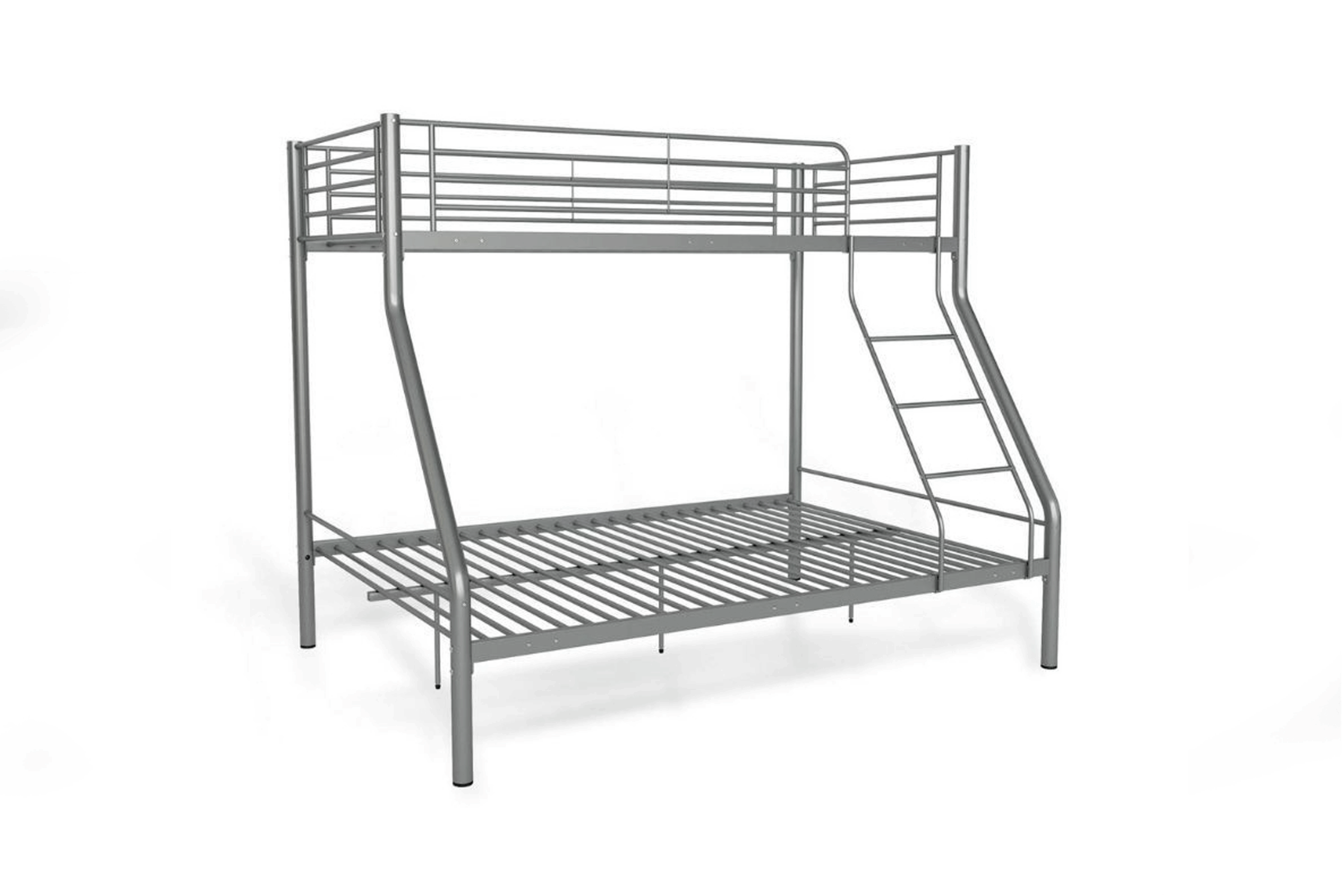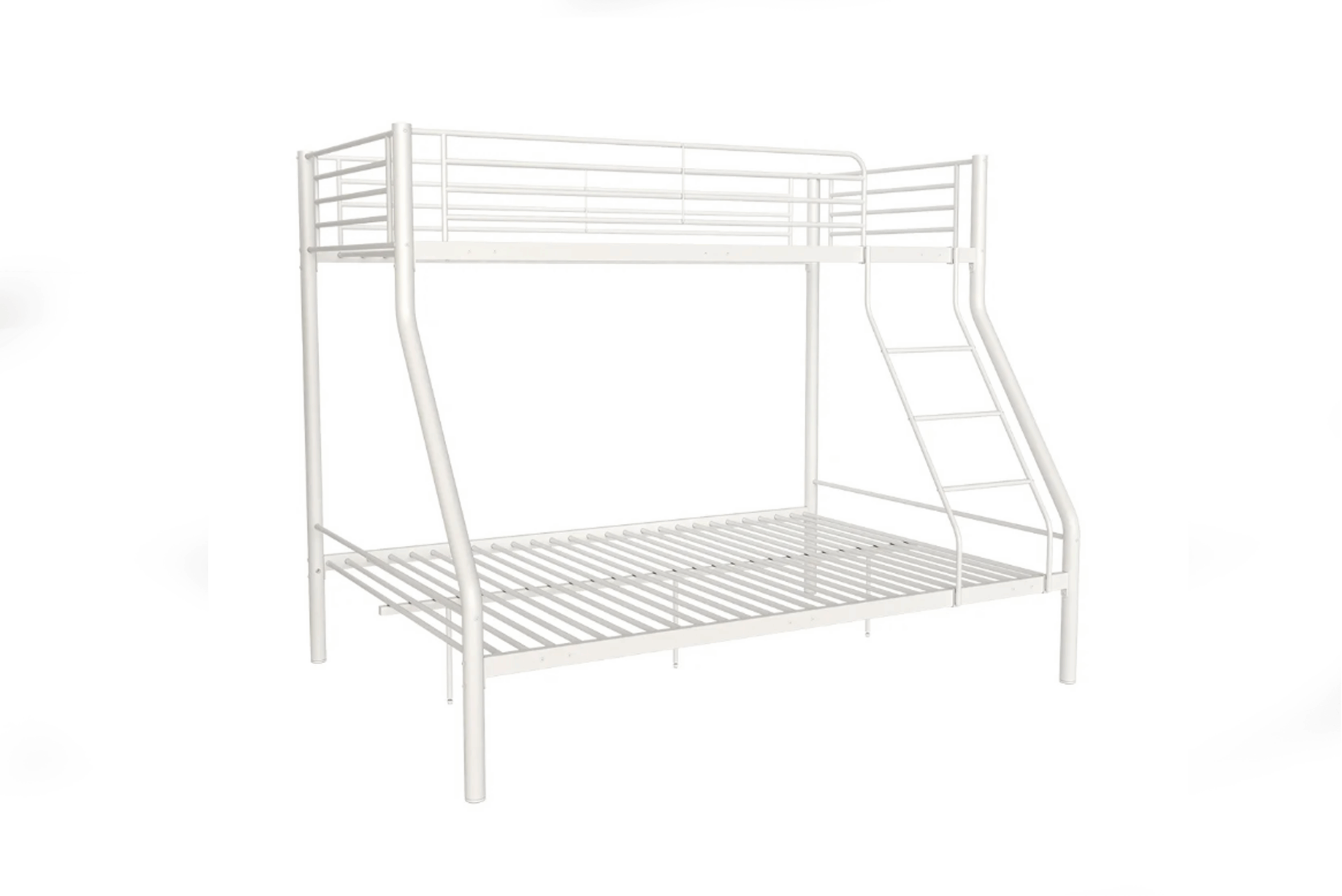 Litera familiar de 135 x 190 inferior y parte superior de 90 x 190. Construida en tubo metálico. La escalera y el quitamiedos, se pueden montar a derecha o izquierda.