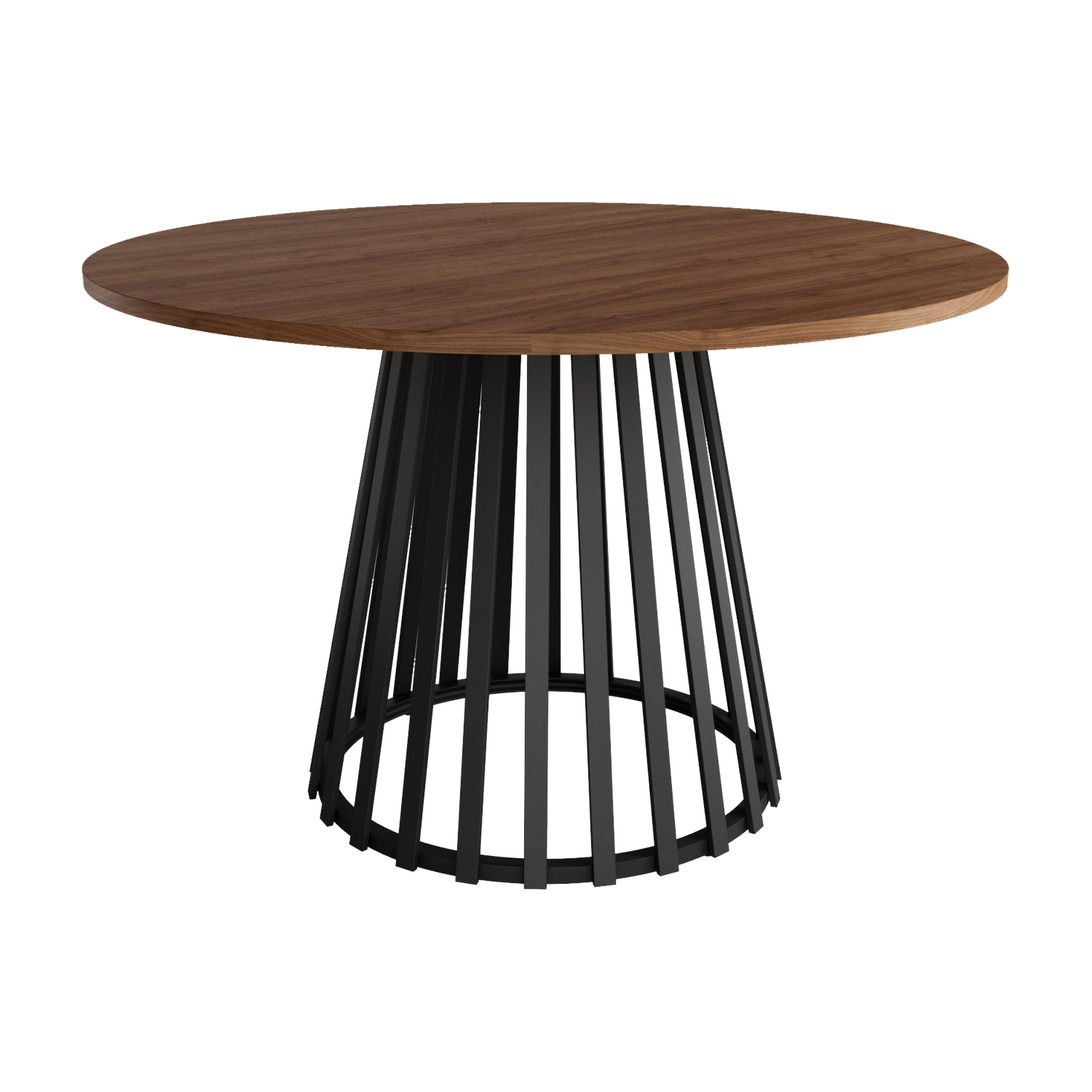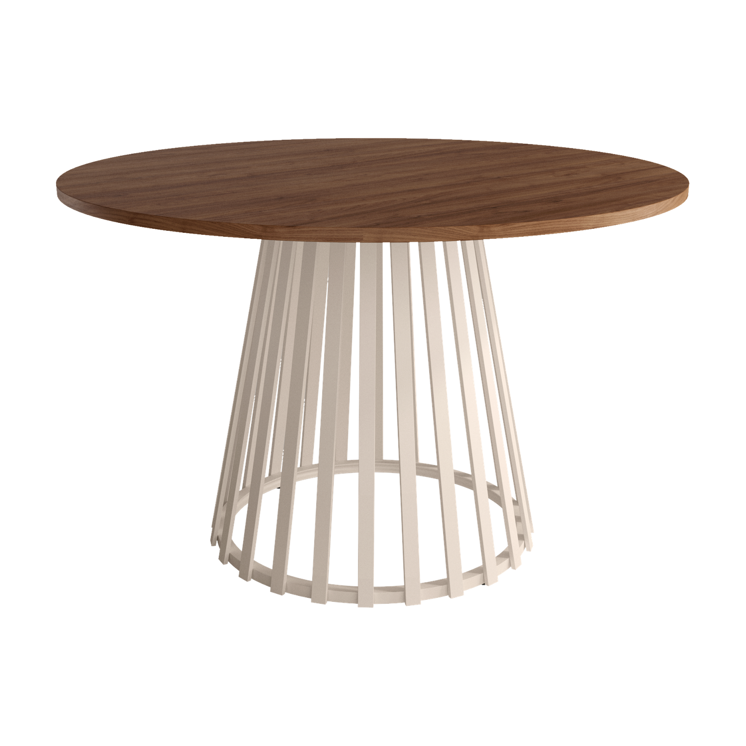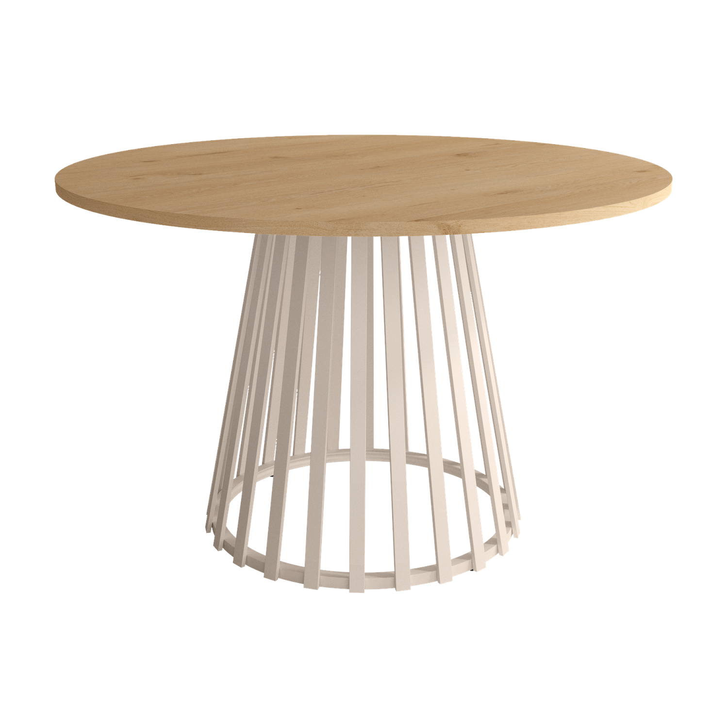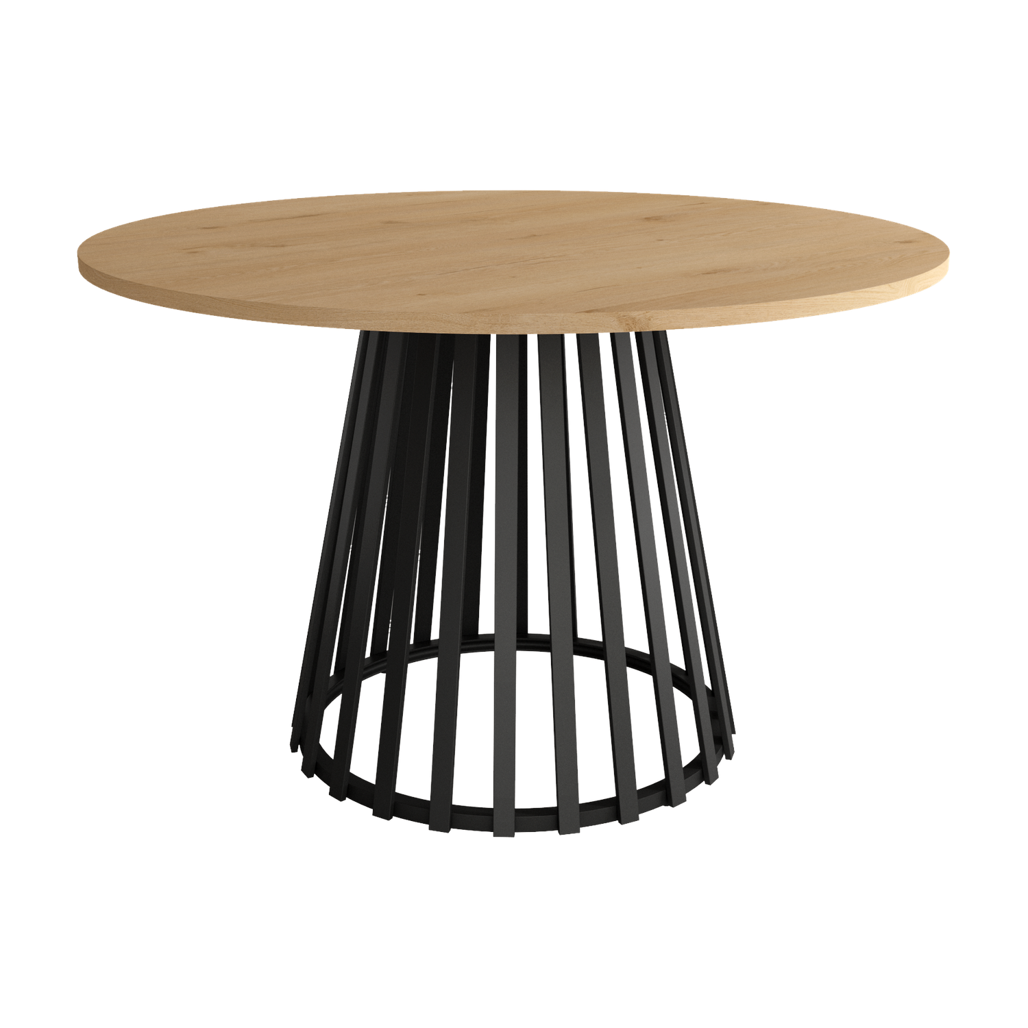 Mesa redonda de comedor con diseño contemporáneo y líneas suaves. Fabricada en España, combina tablero de aglomerado de alta calidad con patas metálicas estables. Su estilo versátil se adapta a ambientes modernos, minimalistas o industriales, ofreciendo funcionalidad y elegancia en cualquier espacio. Montaje sencillo y acabado resistente para un uso diario duradero.