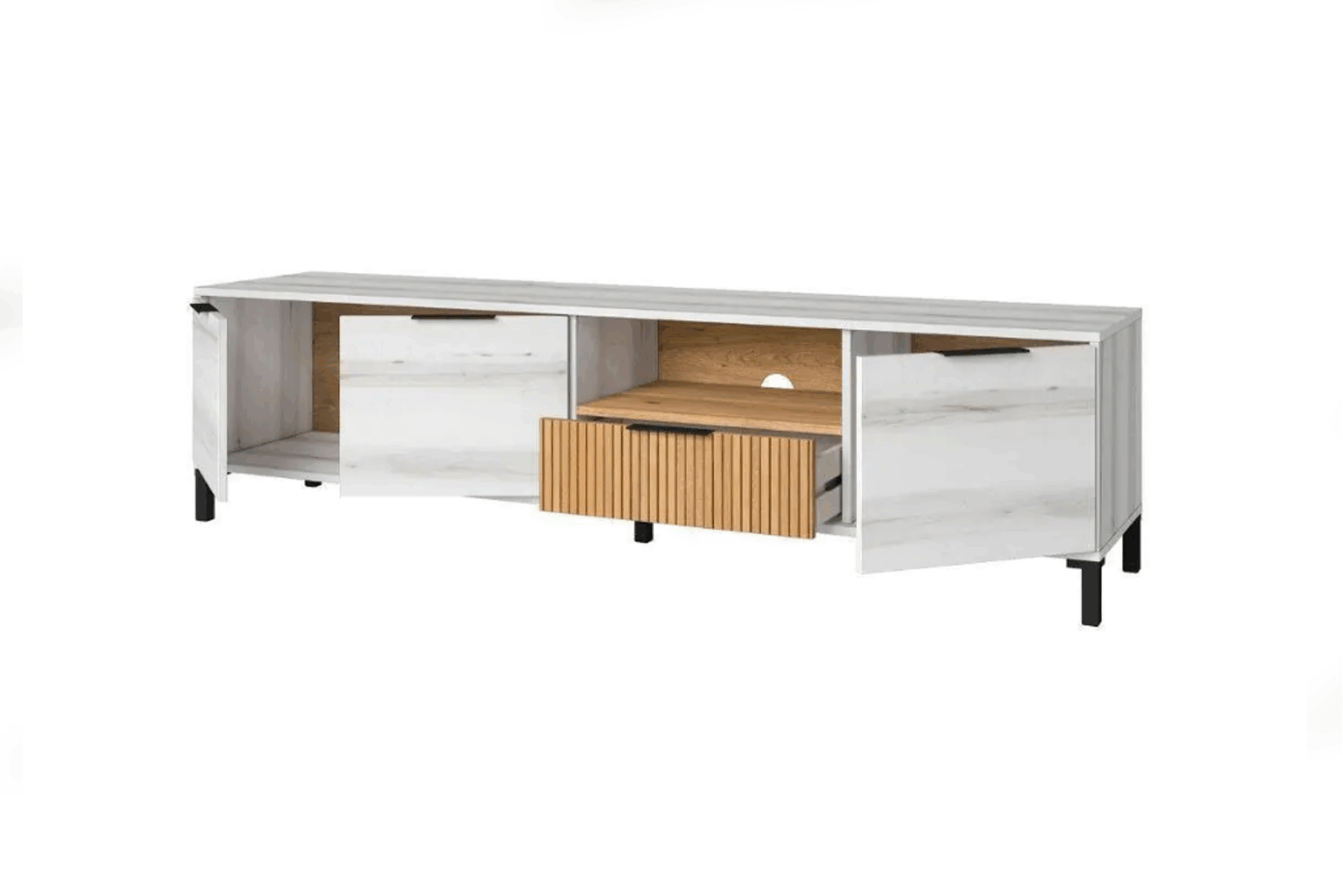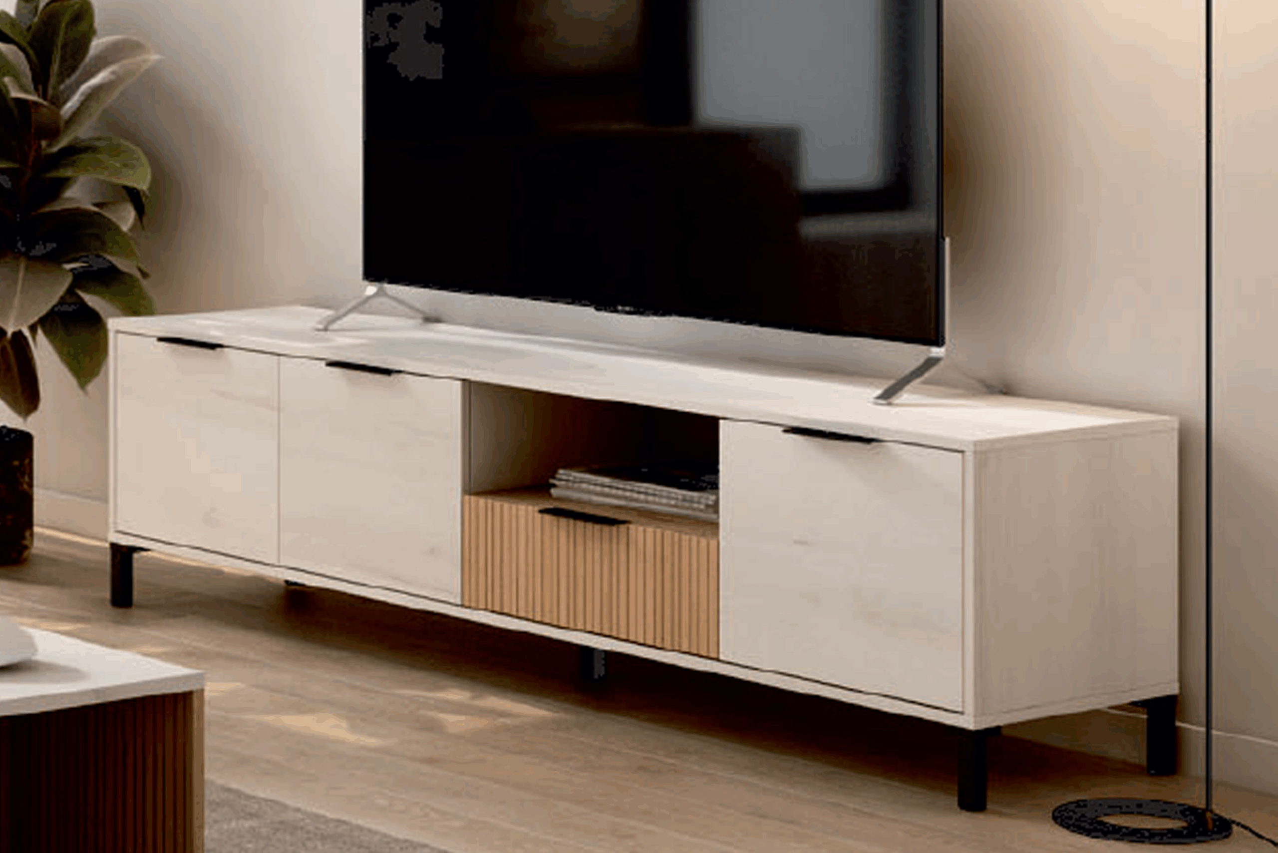El módulo de TV Tokio combina diseño moderno y funcionalidad, con 1 cajón, 2 puertas y 1 hueco para organizar dispositivos y decoración. Su acabado en blanco Albo y roble Rayado aporta frescura y se adapta a distintos estilos. Fabricado en melamina, ofrece gran capacidad de almacenamiento y comodidad. Fabricado en España con materiales de alta calidad. Ideal para renovar tu salón con estilo y orden.