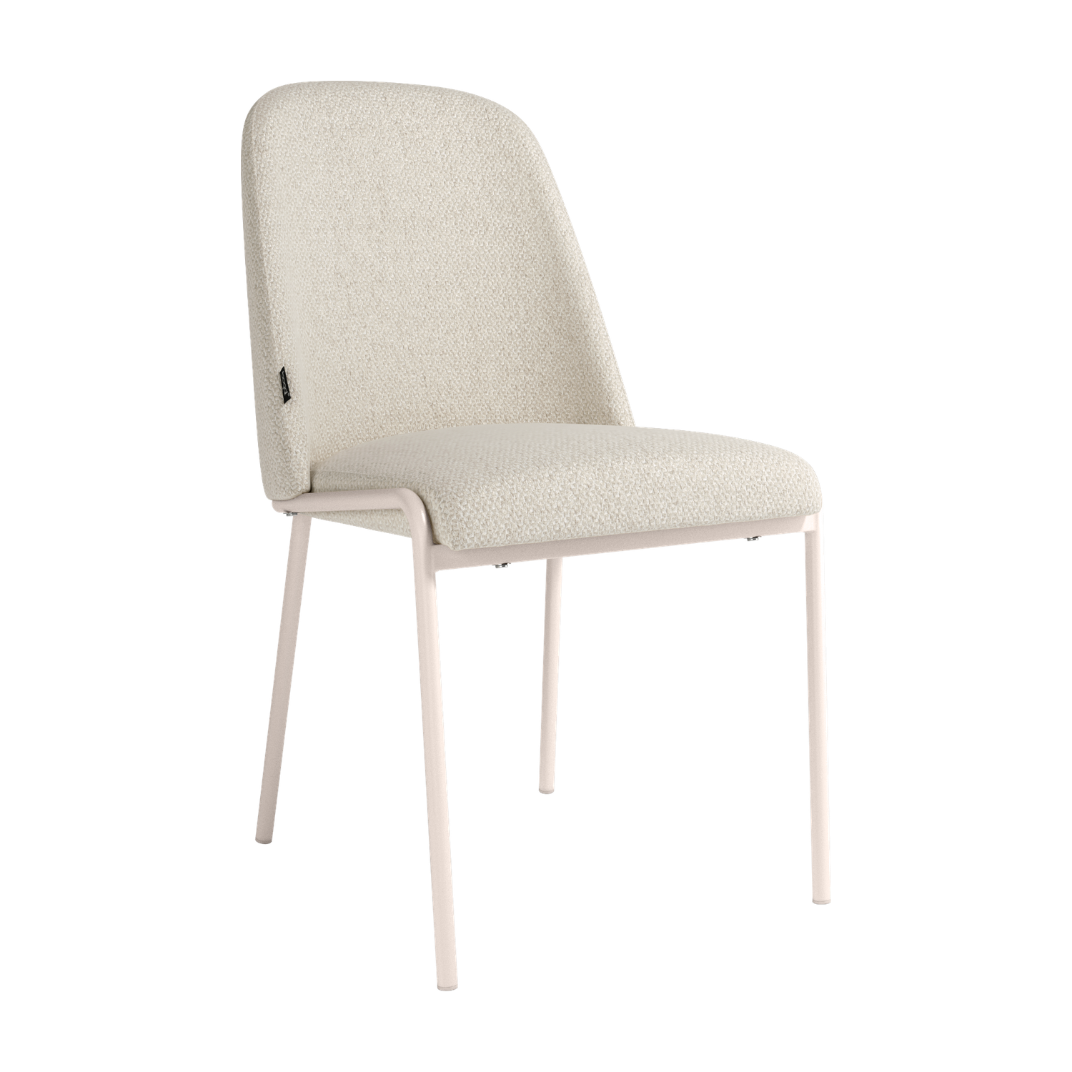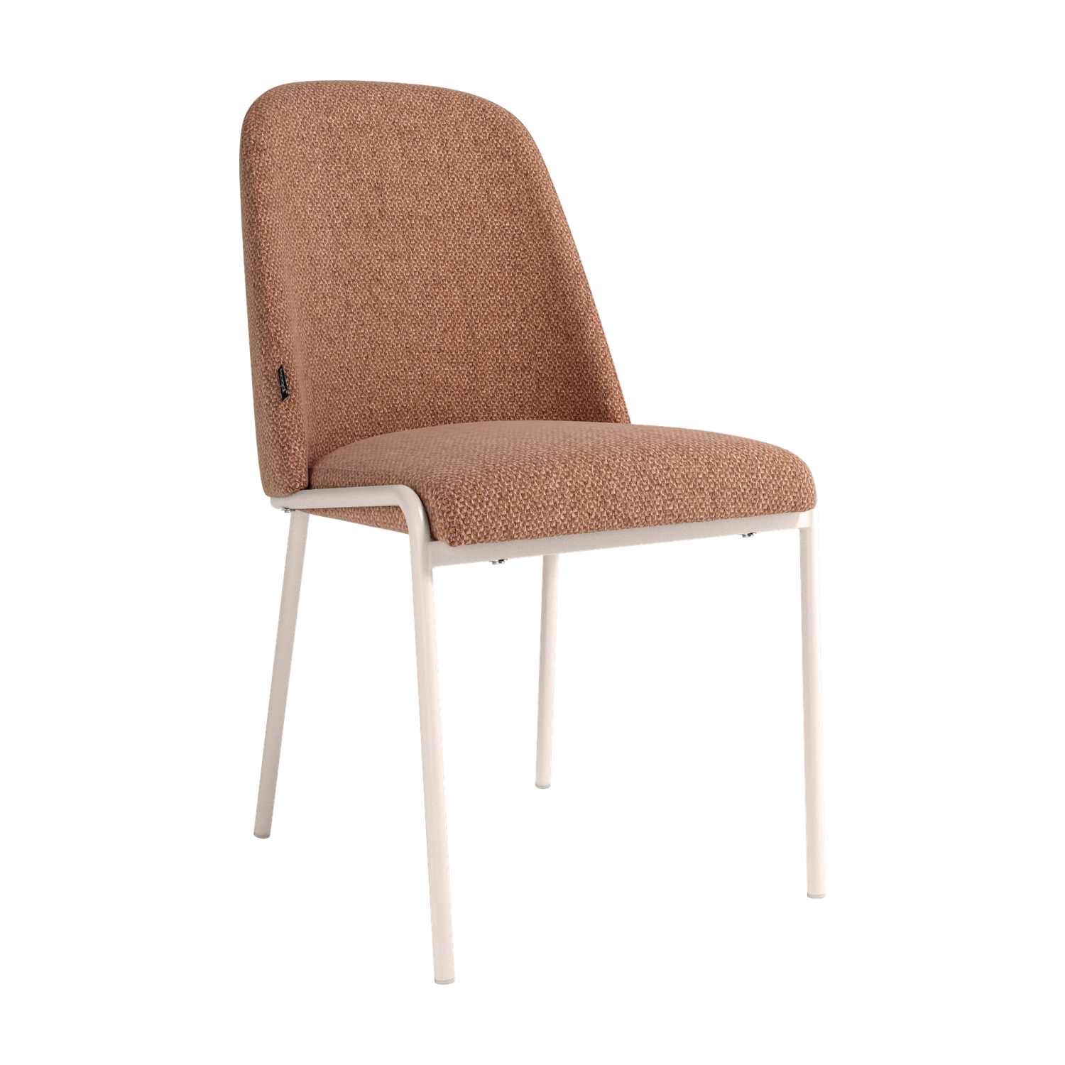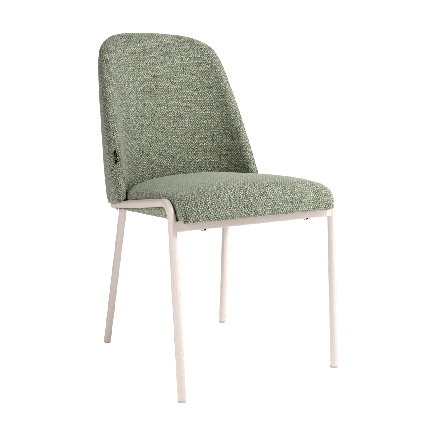 Silla tapizada con respaldo curvado y patas metálicas negras, fabricadas en España. Diseño moderno y minimalista que combina confort, estilo y funcionalidad. Tapicería suave y resistente, estructura estable y formato apilable para optimizar el espacio. Ideales para comedores, salas de estar o espacios comerciales.