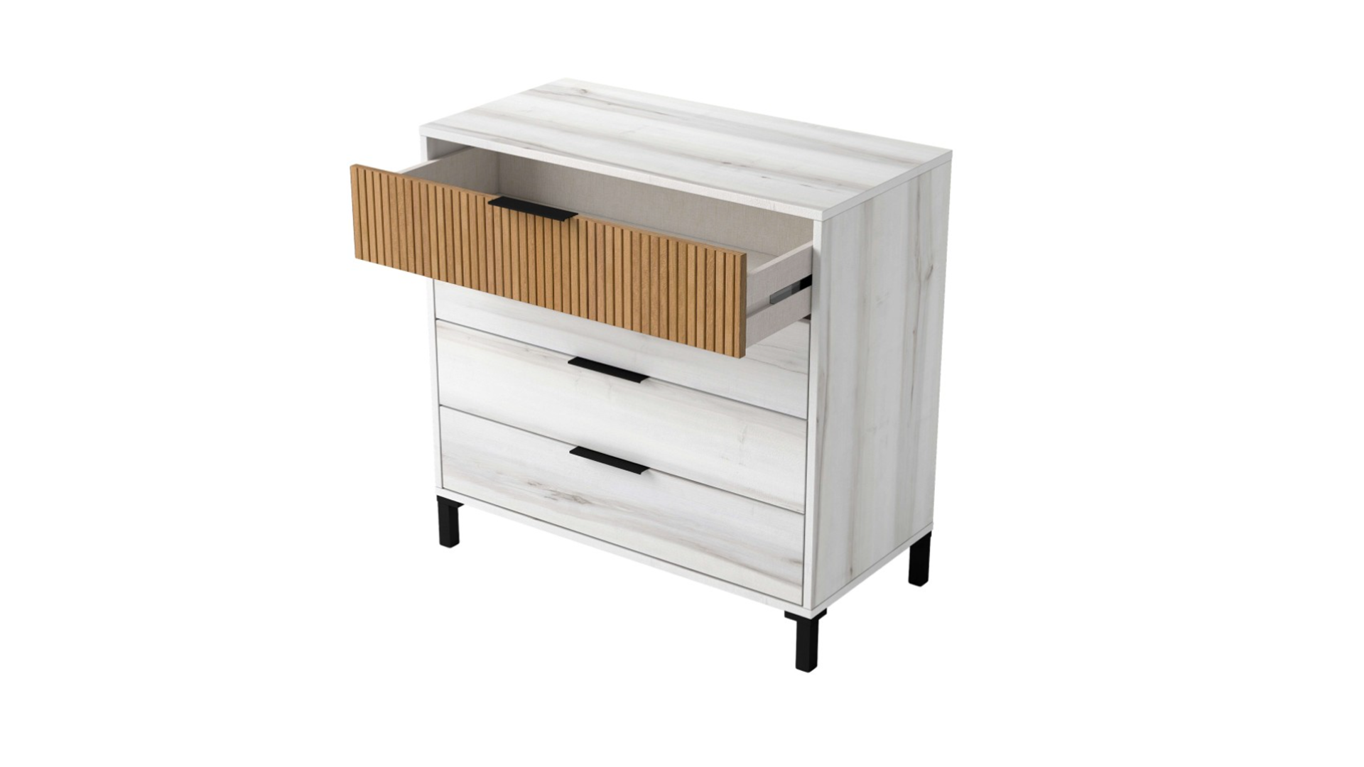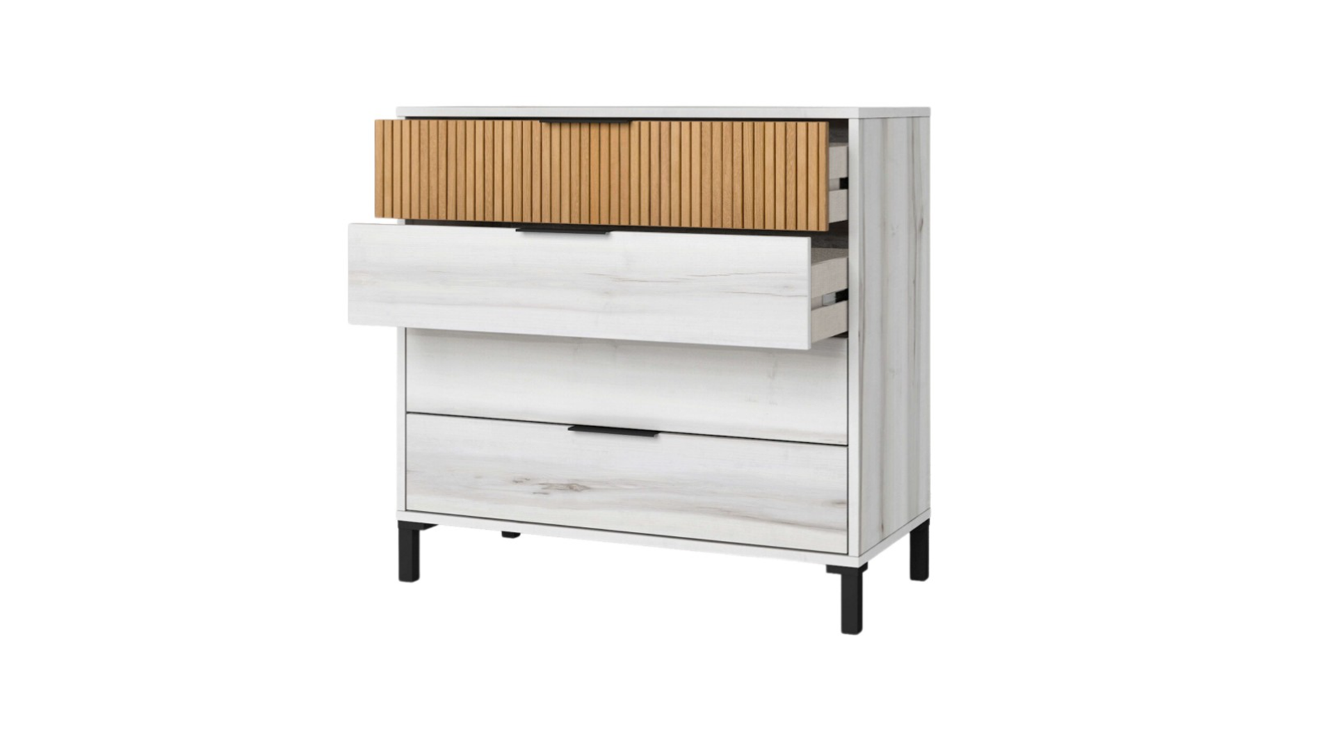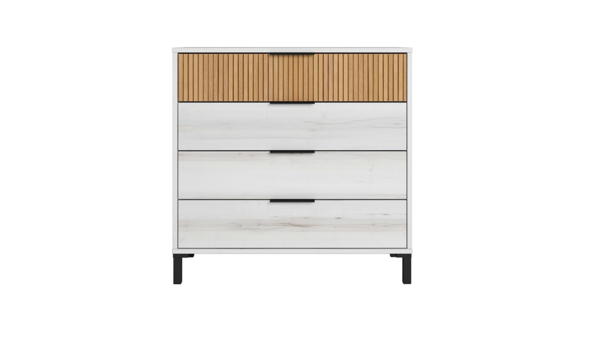 La cómoda Arles combina estilo contemporáneo y funcionalidad, con estructura en melamina blanco albo y roble rayado, y cuatro cajones deslizantes que facilitan la organización. Sus patas altas de 10,4 cm aportan ligereza visual y un toque sofisticado al diseño. oofrece amplio espacio para ropa y accesorios. Ideal para añadir calidez y orden al dormitorio.