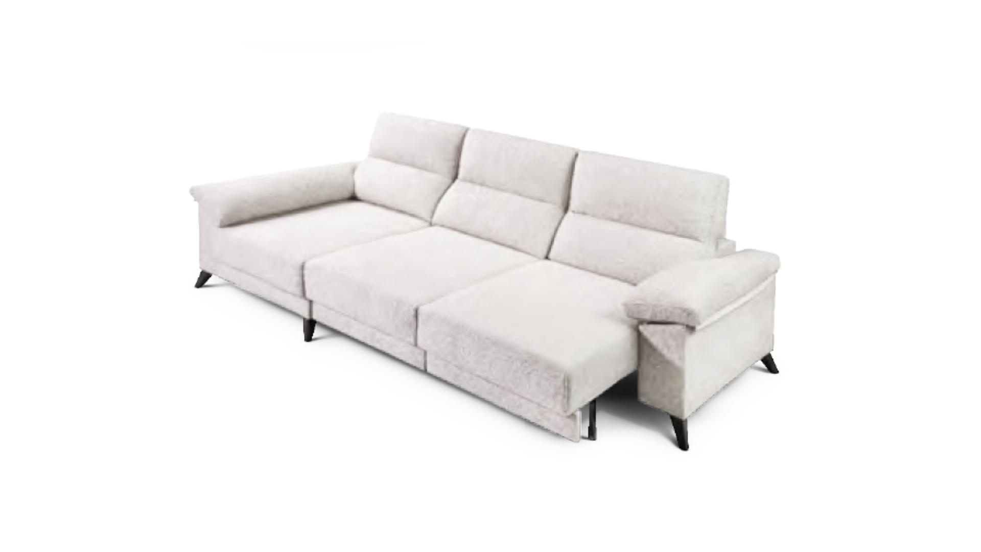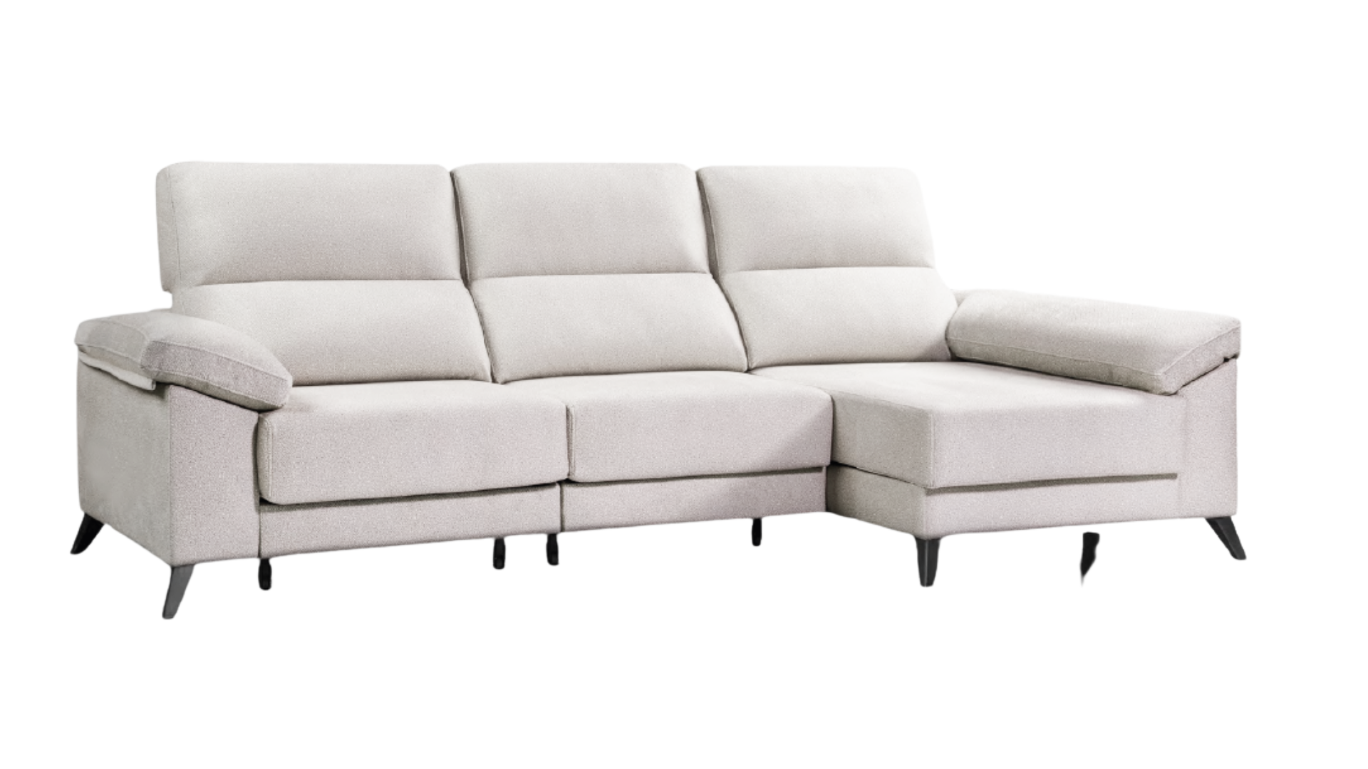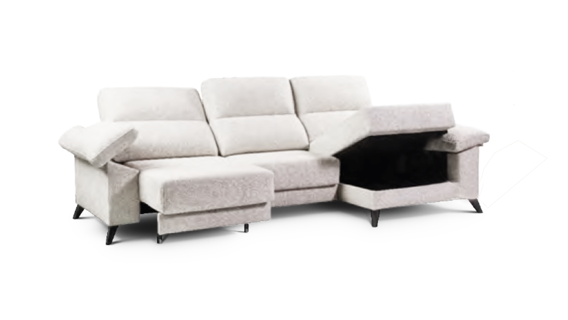 El modelo BOSTON es un sofá de descanso exclusivo, con chaiselongue con arcón. Su estructura está fabricada en madera de pino gallego de alta calidad, con respaldos y brazos rellenos 100 % de fibra y asientos de goma de 30 kg. Incorpora cabezales reclinables multipunto, asientos extraíbles metálicos con arrastre al suelo y brazos con arcón de serie en versión corta y larga. Completa el diseño con patas altas negras de 12,5 cm y medidas de fondo sofá 100 cm, fondo chaiselongue 150 cm y altura total 110 cm.