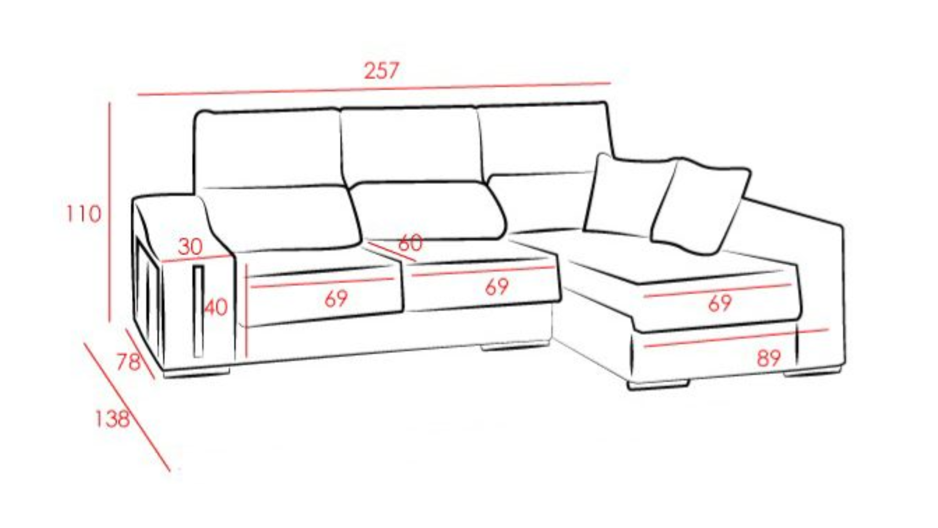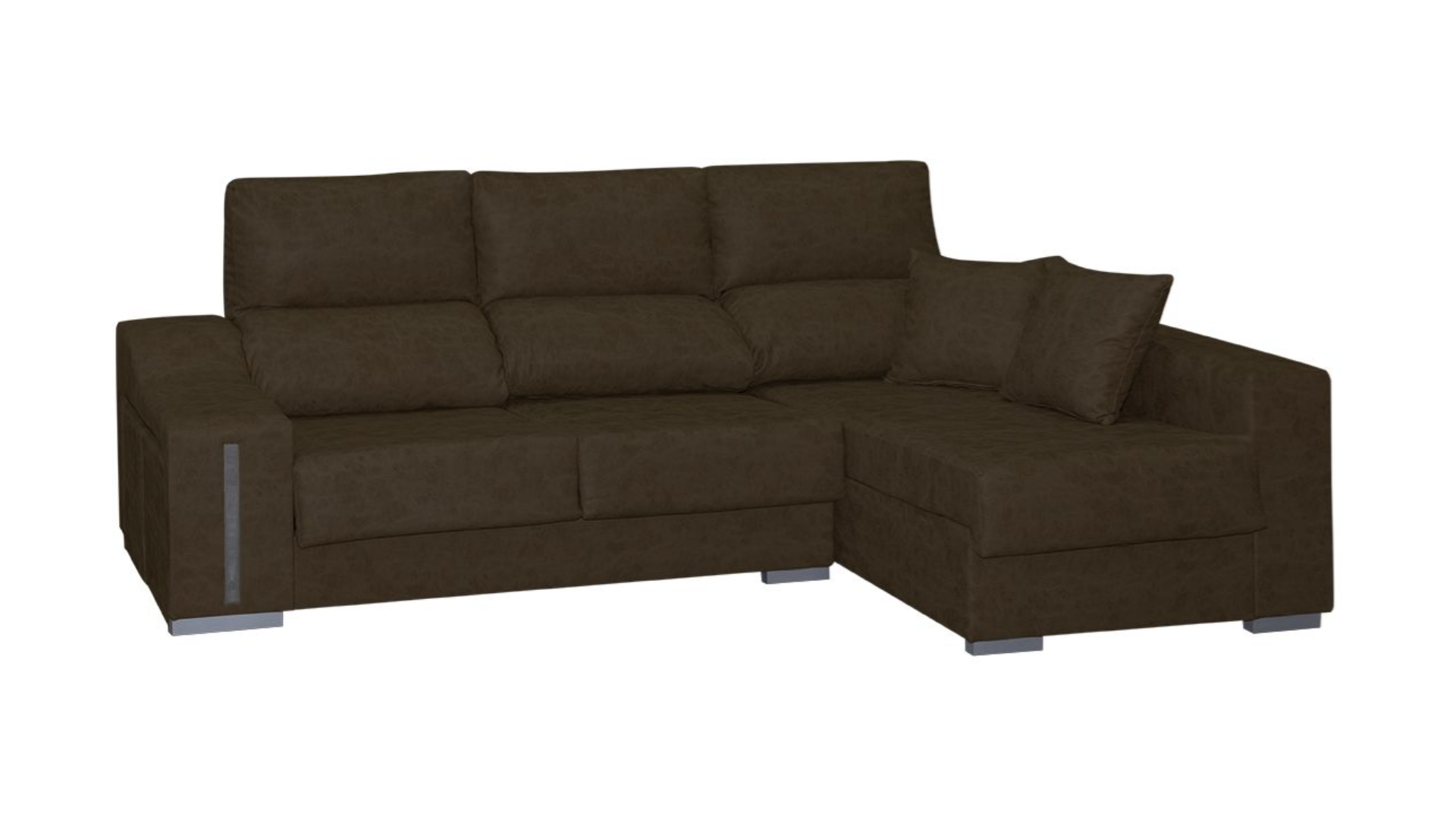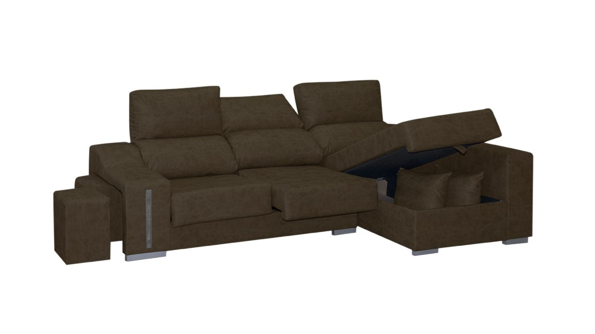 El modelo ORIHUELA es un sofá chaiselongue con estructura de pino macizo, asientos extraíbles con muelle en zig-zag y respaldo reclinable relleno de picado. Incluye arcón, dos taburetes y dos cojines decorativos, con opción de montaje a derecha o izquierda. Sus patas son de aluminio redondas y se compone de dos módulos unidos por chapas metálicas.