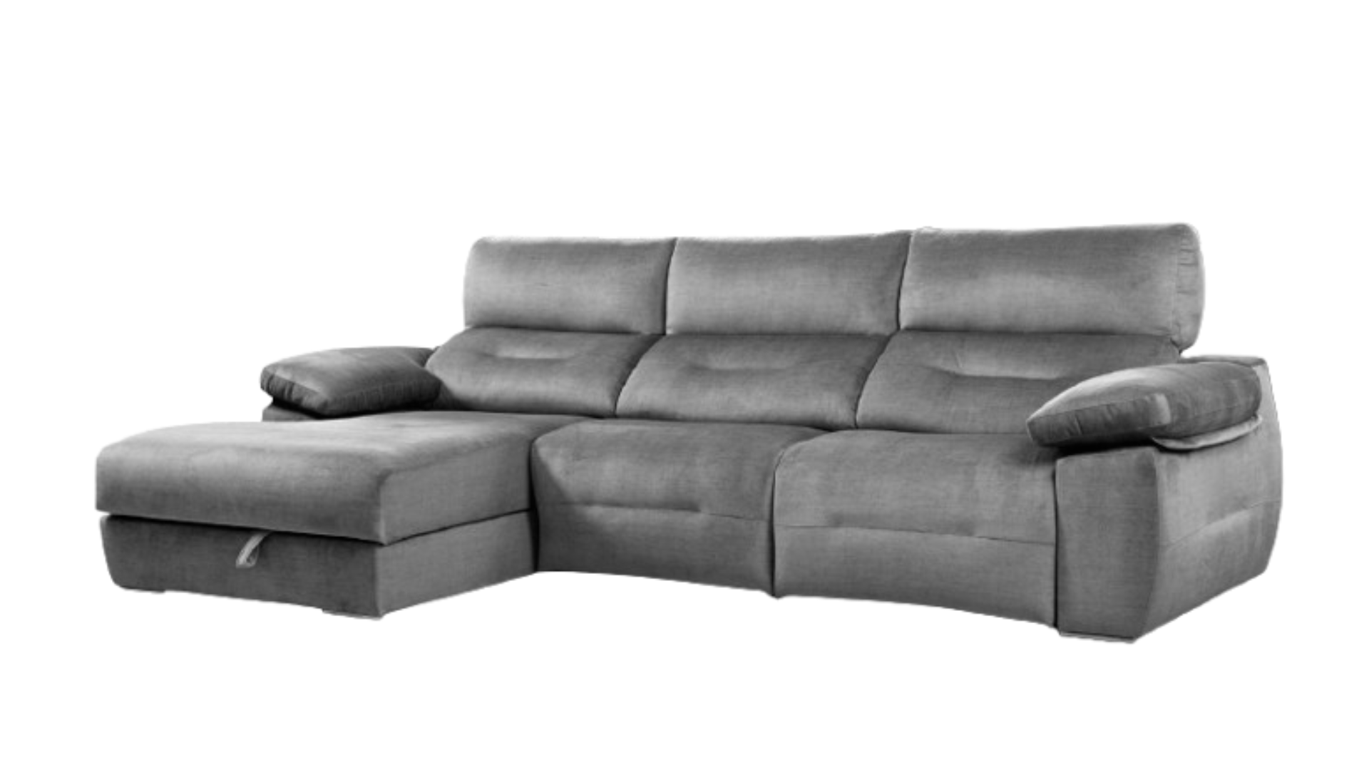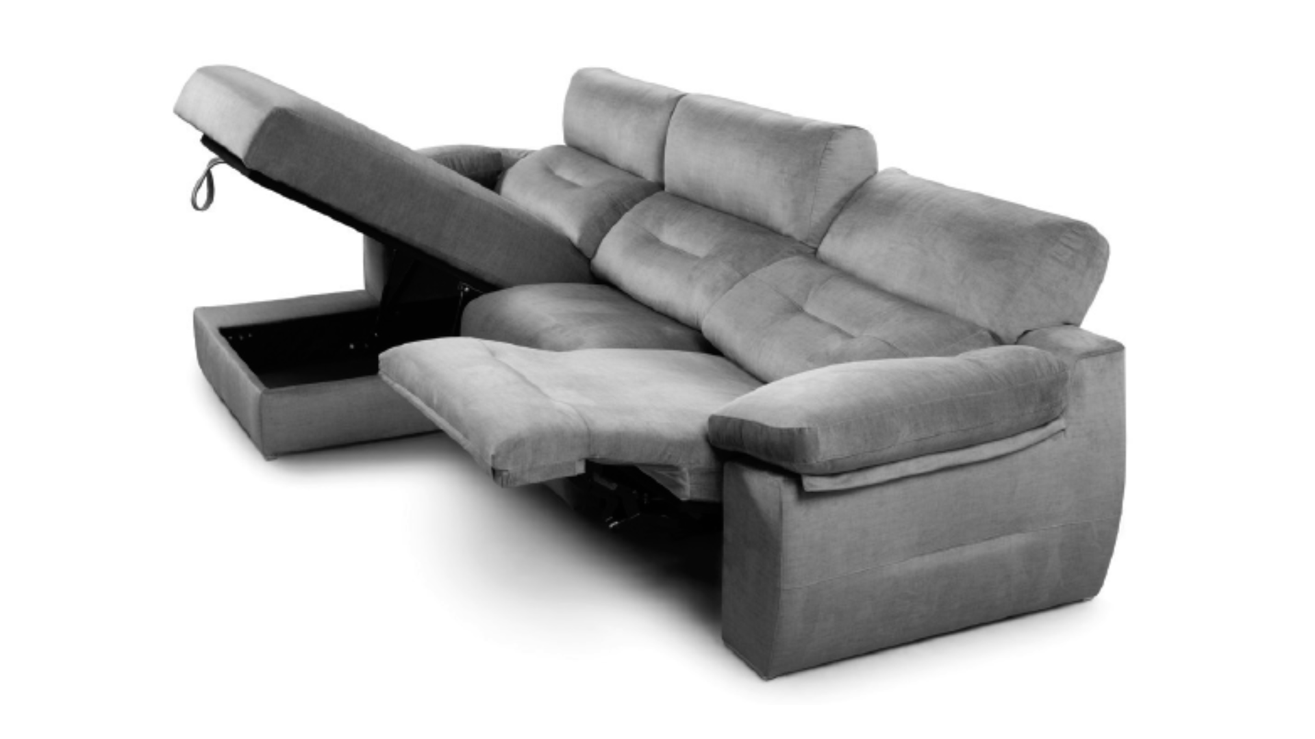 Chaiselongue eléctrico Celia con arcón abatible de gran capacidad en chaiselongue y 2 asientos de 80cm relax eléctricos con viscoelástica en la sentada para un mayor confort.