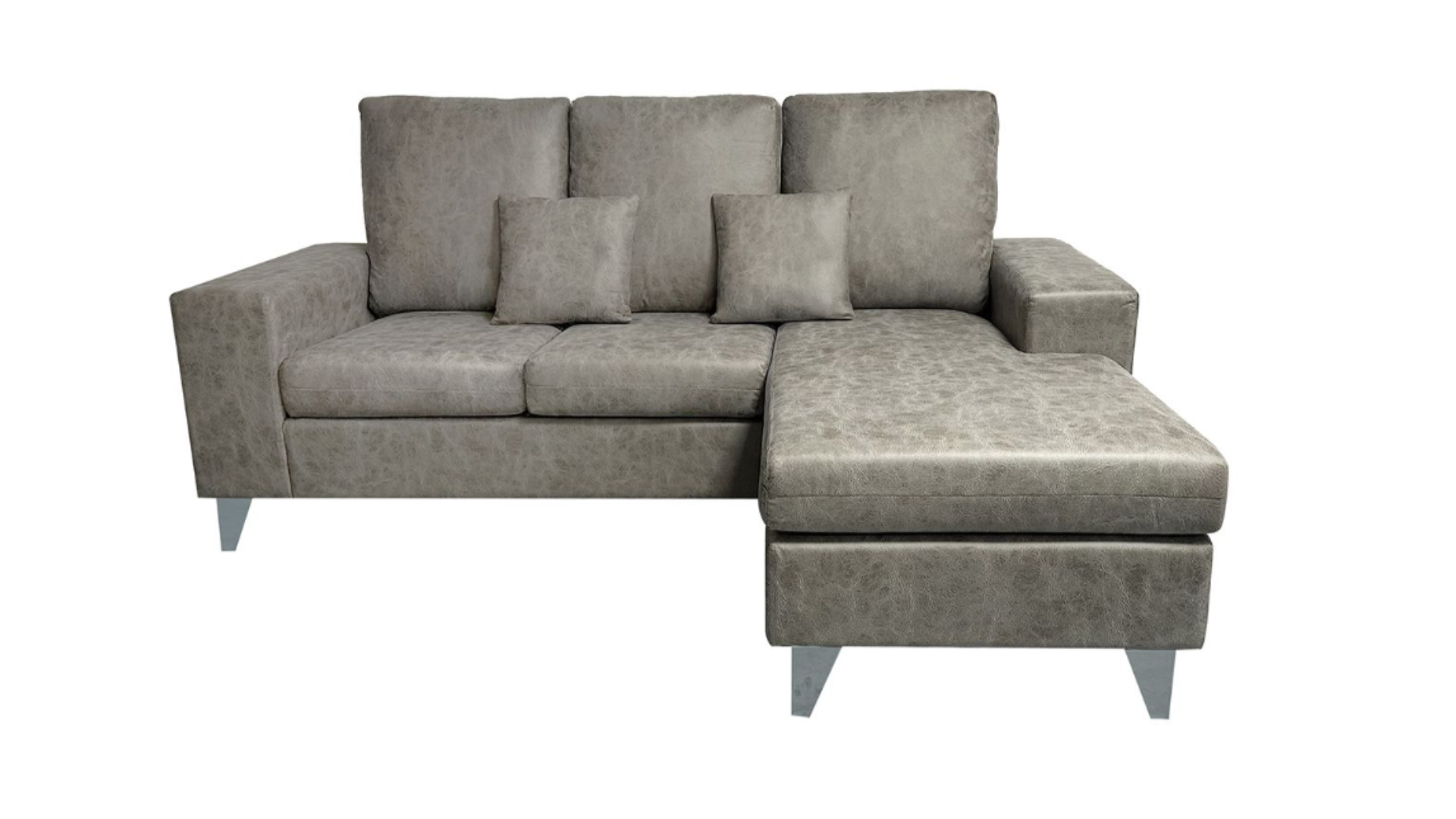 El modelo BIGASTRO es un sofá chaiselongue reversible con diseño moderno y funcional. Cuenta con estructura de madera, relleno de espuma y módulo puff independiente que puede colocarse a derecha o izquierda. Incluye dos cojines decorativos de 35 × 35 cm. Tapizado en microfibra Nolia, disponible en colores piedra y cemento.