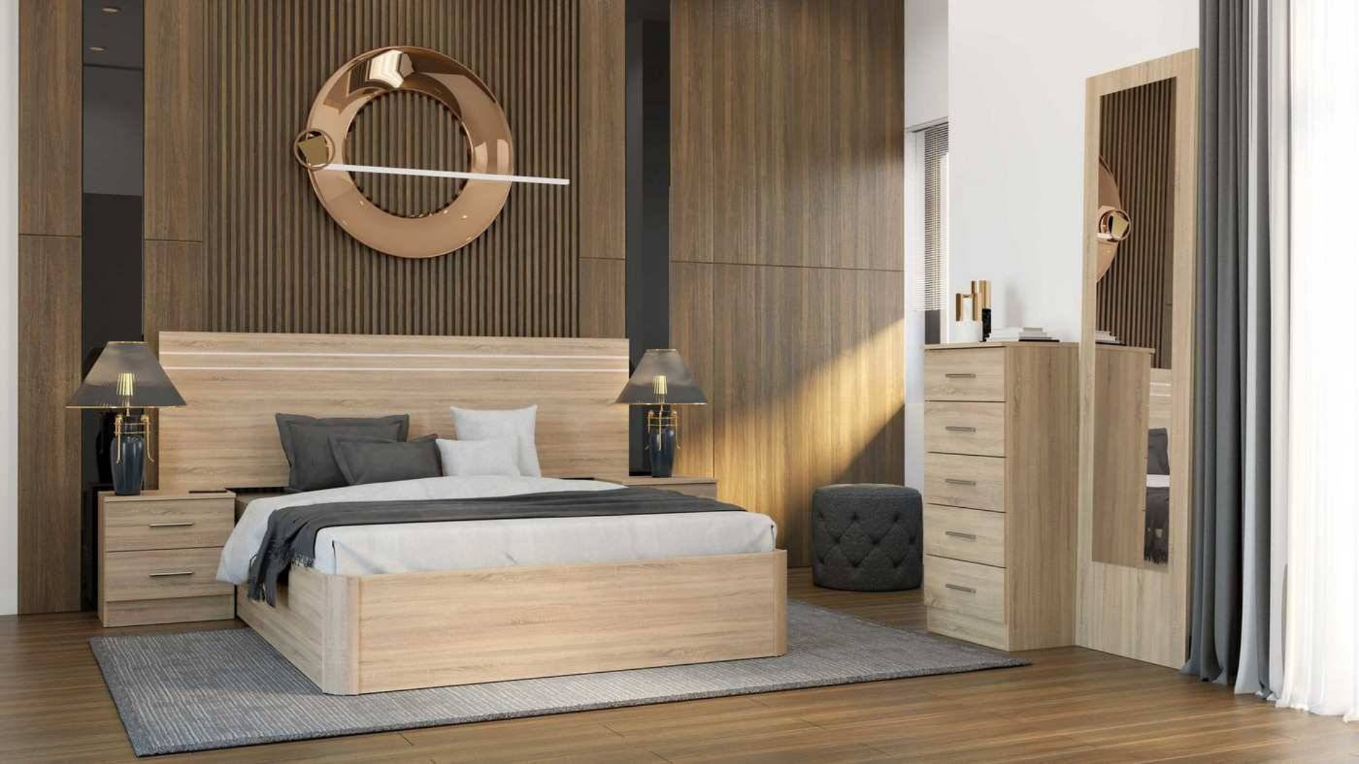 El cabecero Tirilla aporta distinción y carácter al dormitorio gracias a sus líneas decorativas y acabado cálido. Su formato horizontal en tono madera natural crea un fondo acogedor y moderno para la cama. Fabricado en tablero melaminizado, combina durabilidad con estilo contemporáneo, siendo una pieza clave en la composición del conjunto.
