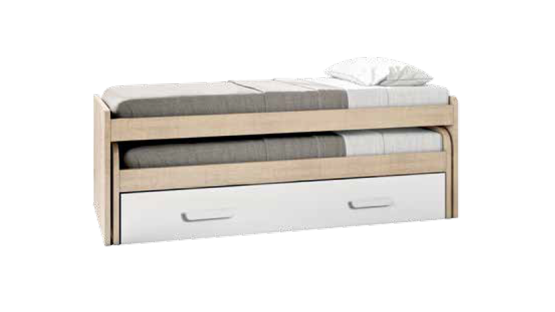 Esta cama compacta, con cama superior de 90×190, cuenta además con un contenedor doble lo cual hace que sea una solución funcional y estética para optimizar el espacio en dormitorios. Incorpora cabezales curvos de 25 mm de espesor y una cama interior reversible de 90×190. Su amplio cajón inferior ofrece doble capacidad de almacenaje, ideal para mantener el orden.