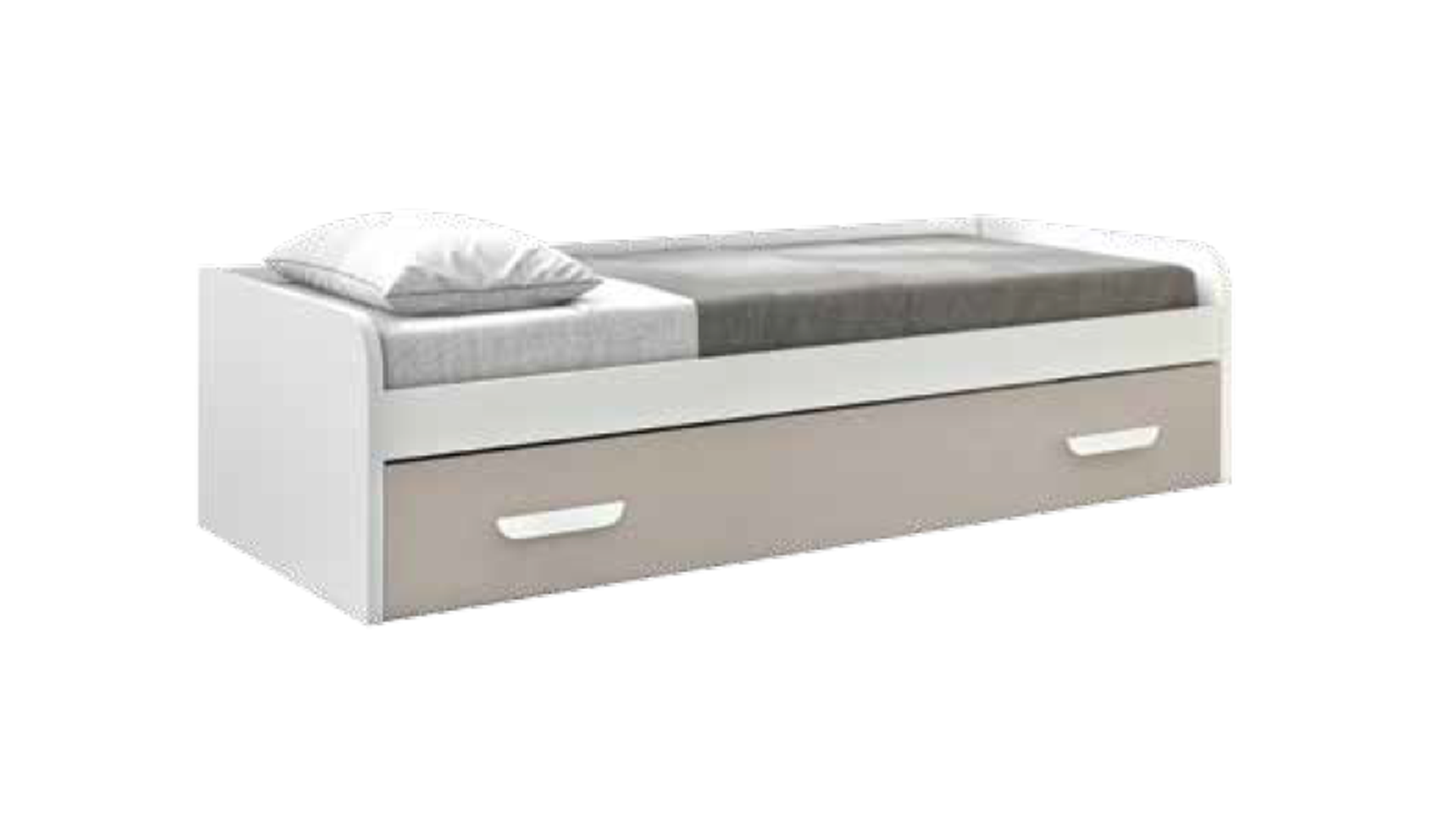 La cama nido con sistema de arrastre es una solución práctica para dormitorios, ofreciendo una cama adicional que se desliza fácilmente. Fabricada con cabezales curvos de 25 mm de espesor, cuenta con una cama superior y una cama inferior, ambas de 90×190.
