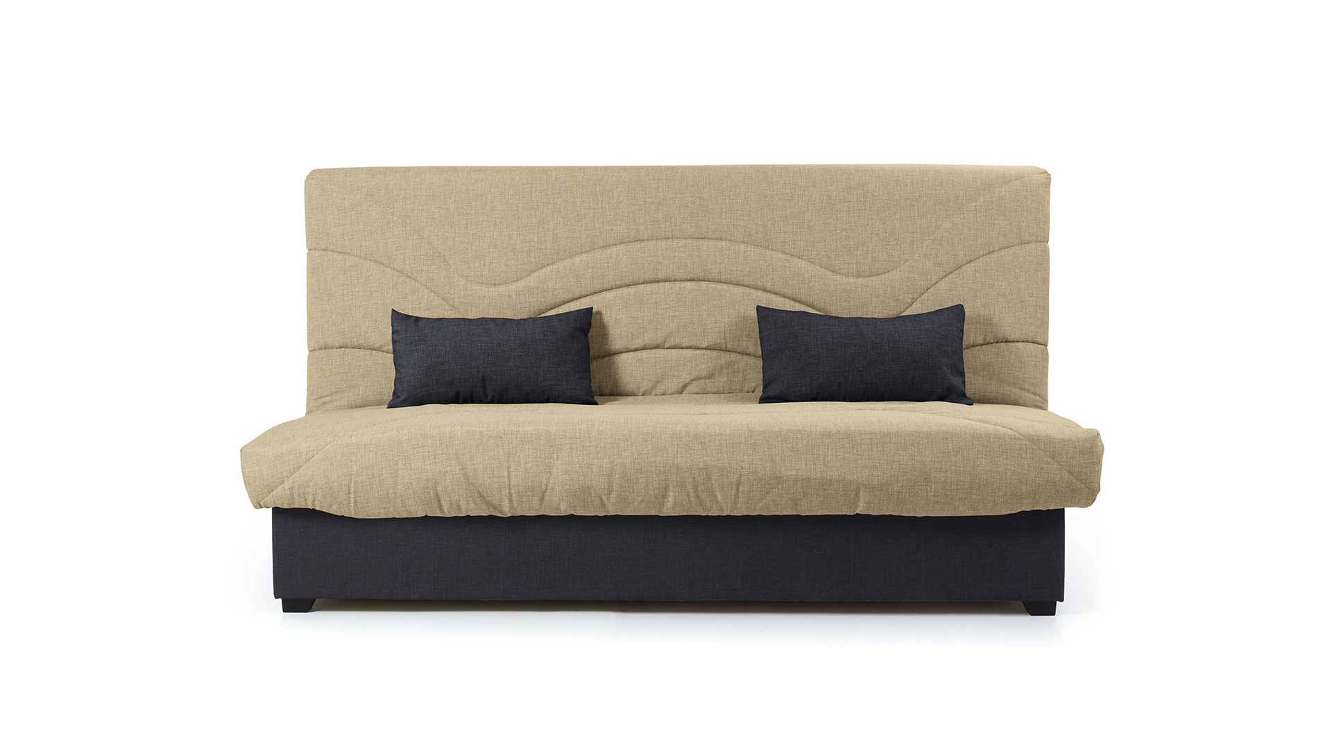Este sofá cama cuenta con estructura metálica y arcón de madera tapizado, con sistema de apertura click clack (tipo libro) por bisagra a presión. Está revestido en loneta acolchada e incluye colchón de 11 cm en espuma de 20 kg con ribete, desenfundable y lavable en seco. Viene con dos cojines y sus medidas son 190×90×90 cm cerrado y 190×42×130 cm abierto. Ideal para combinar funcionalidad, confort y diseño compacto.